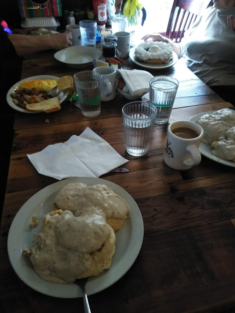 The food was decent, I had eggs Benedict and it was wonderful, but the biscuits and gravy was a little bland and the cinnamon roll was OK, kinda tasted like lemon for some reason though. The service was a little slow, but to their defense they were super busy. They were very sweet though and I loved the atmosphere. Very cute.